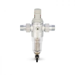 Комбинированные промывные фильтры Varmega сочетают в себе сразу два устройства -сетчатый фильтр прямой промывки и редуктор давления. Фильтр предназначен для предварительной фильтрации воды от различных механических примесей, он отлично задерживает ржавчину, песок, окалины и другой мусор, которого очень много в воде из центрального водопровода. Клапан понижения давления позволяет защитить трубопровод и устройства водопотребления от нежелательных колебаний давления, а также уменьшить расход воды. Максимальное входное давление составляет 16 бар, а давление на выходе может регулироваться в диапазоне от 1.5 до 6 бар, при этом заводская настройка выходного давления настроена на 3 бар. Манометр не входит в комплект поставки, но на корпусе с двух сторон есть места для подключения манометра. Благодаря своим компактным размерам, фильтр можно легко устанавливать в местах с ограниченным пространством, при этом монтаж допускается только на горизонтальном трубопроводе колбой вниз. Направление потока определяется стрелкой на корпусе. Состав фильтра: Корпус фильтра в сборе с клапаном понижения давления из латуни с разъемными соединениями с наружной резьбой для подключения к трубопроводу, с резьбовыми отверстиями 1/4" для манометра с обеих сторон Колба из латуни (горячая вода) или ударопрочного прозрачного пластика (холодная вода) Сетчатый фильтрующий элемент Дренажный сливной кран Ключ для колбы