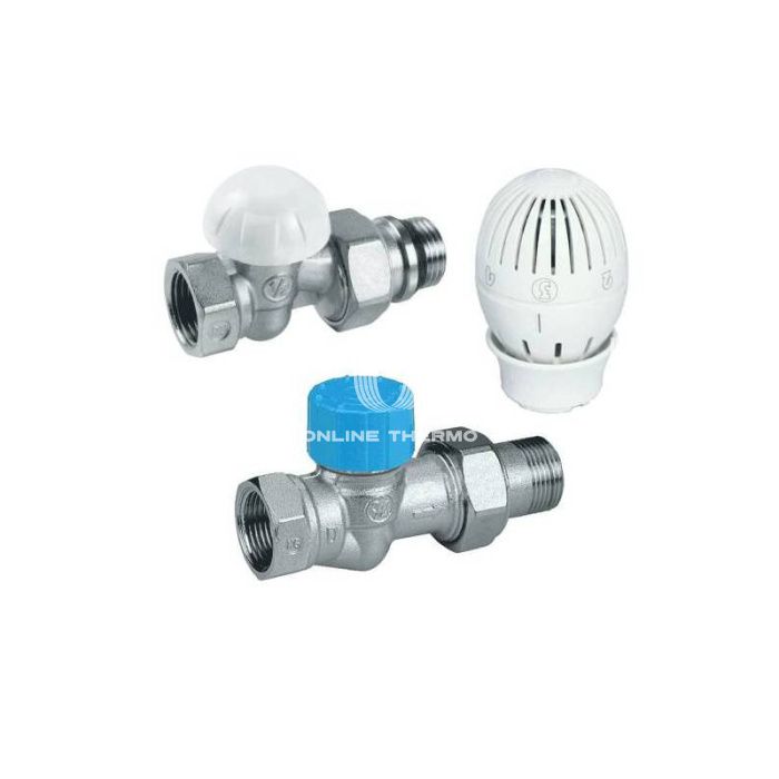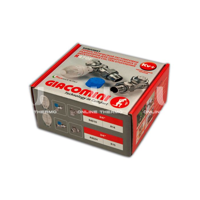 Комплект арматуры для подключения и термостатического регулирования радиаторов отопления Giacomini предназначен для подсоединения радиатора к системе отопления и индивидуального автоматического регулирования подачи теплоносителя в радиатор с целью поддержания температуры в помещении на заданном уровне и экономии энергии. Комплект может использоваться для подключения к радиаторам отопления различных типов, для двух трубных или однотрубных систем. Термостатический комплект R470F поставляется в красочной коробке и состоит из трех элементов: термостатического клапана, термостатической головки и отсечного балансировочного клапана. Комплект выпускается в размере 1/2", для автономных и двухтрубных систем, и в версии 3/4" с увеличенным расходом, для однотрубных систем с вертикальными стояками. Установленный на радиаторе комплект производит автоматическое регулирование подачи теплоносителя в радиатор, поддерживая температуру в помещении на заданном уровне. Изменение температуры в комнате приводит к изменению объема жидкости в сенсоре, находящемся внутри головки. Изменение объема приводит к перемещению внутреннего механизма, обеспечивающего открытие или закрытие клапана, для изменения количества теплоносителя, поступающего в радиатор. При достижении необходимой температуры в комнате, термоголовка постепенно закрывает клапан, позволяя протекать только небольшому количеству воды, для поддержания в комнате заданной температуры. Технические характеристики: рабочая температура воздуха: +8...+32°С; допустимая относительная влажность воздуха: 85%; допустимая концентрация гликоля: 50%; испытательное давление: 15 бар. Комплект поставки: клапан термостатический R402H прямой арт. R402HX004 - 1 шт.; клапан запорный R15TG прямой арт. R15X034 -1 шт.; элемент термостатический (головка термостатическая) R470H арт. R470HX001 - 1 шт.; паспорт - 1 шт.