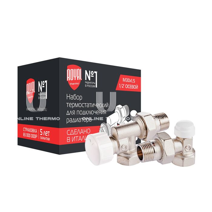 Комплект термостатический осевой с запорным угловым клапаном Royal Thermo RTE 07.011 (НС-1442892), DN15 1/2" ВР-НР, без преднастройки