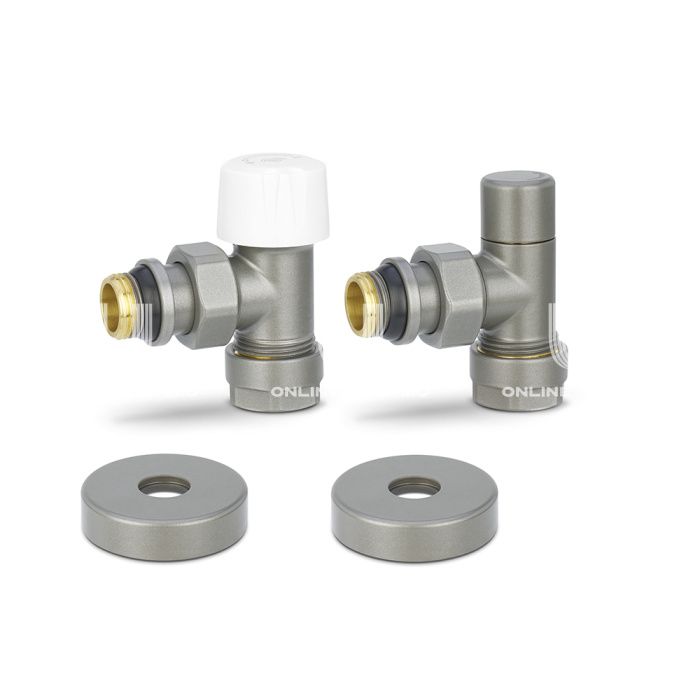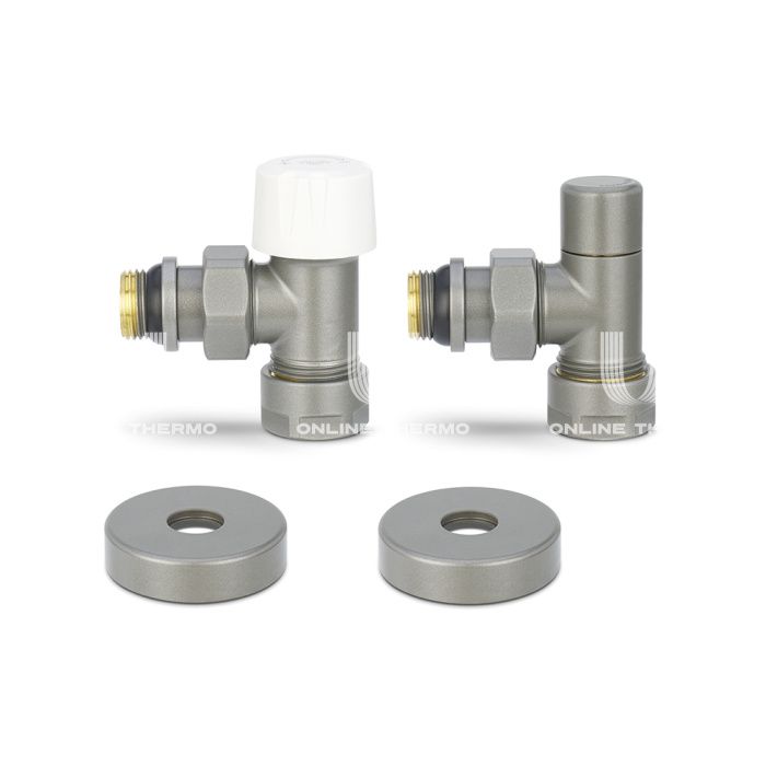 Состав комплекта:Клапан термостатический угловой, клапан запорный угловой