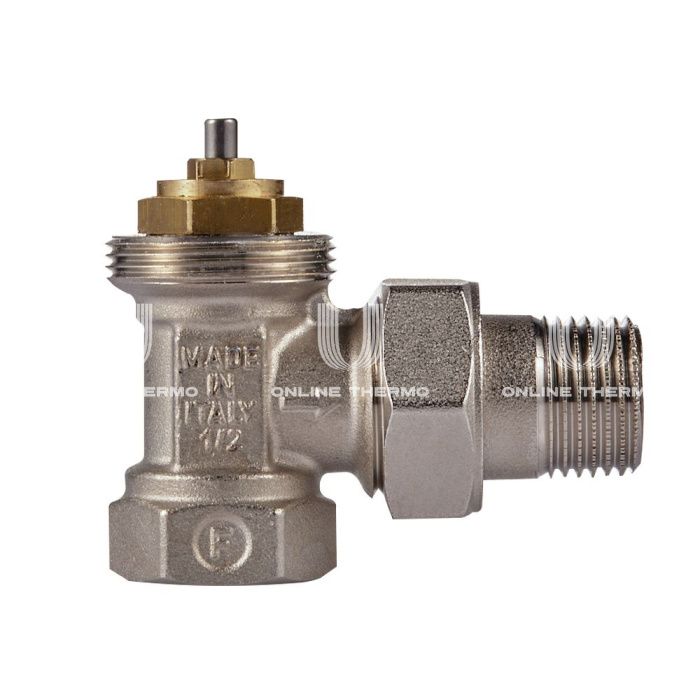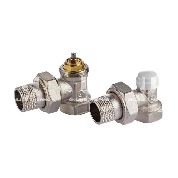 Состав комплекта:Клапан термостатический угловой, клапан запорный угловой