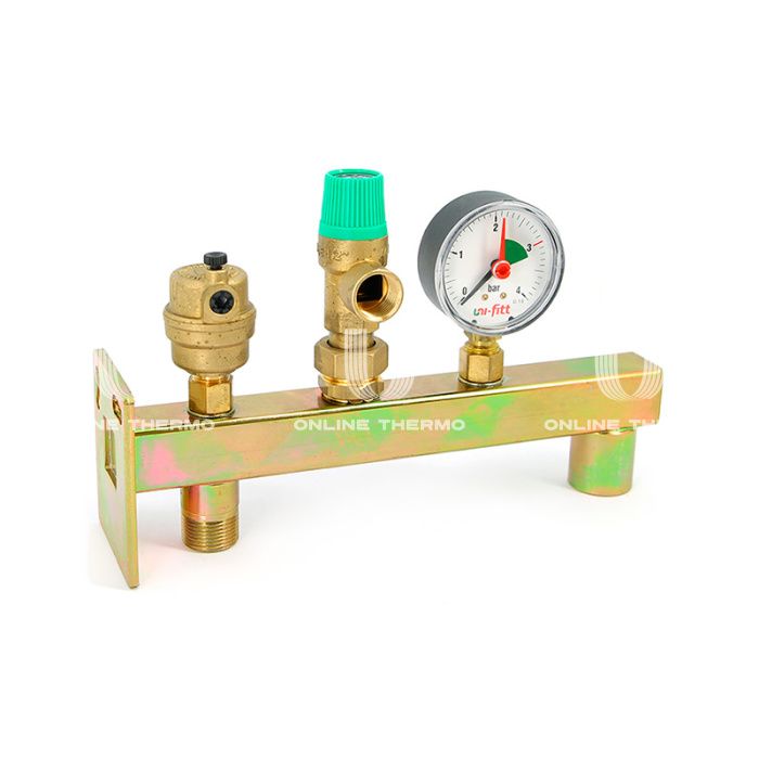 Консоль для подключения расширительного бака с группой безопасности котла Uni-fitt серий 255D и 256D используется для защиты бытовых систем отопления от превышения давления, показа текущего давления и удаления воздуха из системы, а также для компактного размещения мембранного расширительного бака до 24 л. В качестве теплоносителя может использоваться вода или незамерзающие жидкости, предназначенные для использования в системах отопления. Консоль состоит из корпуса с монтажной площадкой для крепежа на стене, установленных на нем предохранительного клапана, воздухоудалителя и манометра. Патрубок подключения расширительного бака может быть снабжён отсекающим клапаном, позволяющим демонтаж бака без слива теплоносителя из системы. Манометр и воздухоотводчик подключены к корпусу консоли через автоматические запорные клапаны, позволяющими демонтировать их без опорожнения системы. Группа безопасности Uni-fitt выполняет следующие функции: подключение расширительного бака к системе теплоснабжения; защита от превышения давления в системе; отвод из системы воздуха; индикация давления в системе на уровне манометра.
