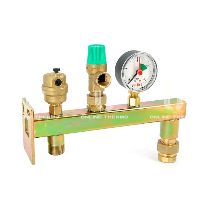 Консоль для подключения расширительного бака с группой безопасности котла Uni-fitt серий 255D и 256D используется для защиты бытовых систем отопления от превышения давления, показа текущего давления и удаления воздуха из системы, а также для компактного размещения мембранного расширительного бака до 24 л. В качестве теплоносителя может использоваться вода или незамерзающие жидкости, предназначенные для использования в системах отопления. Консоль состоит из корпуса с монтажной площадкой для крепежа на стене, установленных на нем предохранительного клапана, воздухоудалителя и манометра. Патрубок подключения расширительного бака может быть снабжён отсекающим клапаном, позволяющим демонтаж бака без слива теплоносителя из системы. Манометр и воздухоотводчик подключены к корпусу консоли через автоматические запорные клапаны, позволяющими демонтировать их без опорожнения системы. Группа безопасности Uni-fitt выполняет следующие функции: подключение расширительного бака к системе теплоснабжения; защита от превышения давления в системе; отвод из системы воздуха; индикация давления в системе на уровне манометра.