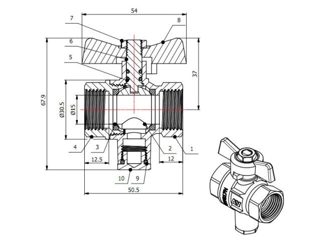 Кран шаровый 1/2' вн.-вн. бабочка, под датчик температуры PN40, AV Engineering(Латунь, макс. 40 бар, макс. 110 °С)