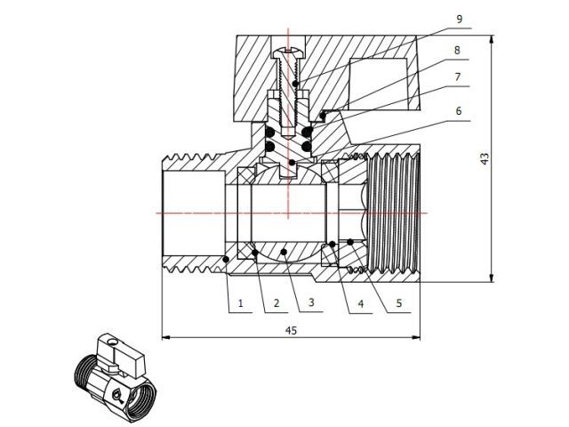 Кран шаровый MINI 1/2' нар.-вн. красная ручка, AV Engineering(Латунь, макс. 16 бар, макс. 110 °С)