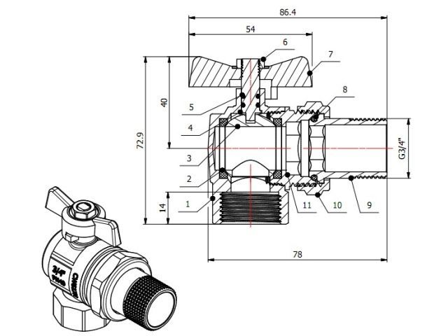 Кран шаровый угловой 3/4' нар.-вн. бабочка (со сгоном) PN40, AV Engineering(Латунь, макс. 40 бар, макс. 110 °С)