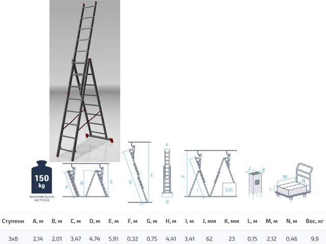 Высота лестницы - 474см, высота стремянки - 201см, высота секции - 214см. Макс. нагрузка -150 кг. Варианты использования: - приставная лестница; - приставная выдвижная лестница; - стремянка; - стремянка с выдвинутой секцией; - функция лестничных пролётов. Технические преимущества: - прочность и надёжность при небольшом весе изделия; - стойки и ступени изготовлены из прессованного профиля; - многократная развальцовка в соединении ступеней со стойками обеспечивает высокую прочность и долговечность рифлёные ступени с шагом 260мм для безопасного подъёма и спуска; - алюминиевые направляющие кронштейны надёжно удерживают выдвижную секцию во всех рабочих положениях; - зацепы с автоматическим фиксатором; - широкая поперечная траверса обеспечивает высокую устойчивость; - надёжно закреплённые на стойках и траверсе пластиковые наконечники препятствуют скольжению; - верхняя секция легко вынимается и устанавливается и может служить отдельной приставной лестницей; - функция лестничных пролётов с использованием верхней съёмной секции.