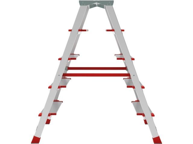 Ориентация ступеней на обе стороны позволяет работать, не переставляя стремянку и тем самым экономя время Максимальная прочность и надёжность при небольшом весе изделия Легко устанавливается и обеспечивает высокий уровень комфорта Стойки и ступени из экструдированных алюминиевых профилей увеличенного сечения Ступени глубиной 130 мм увеличенной толщины Рифлёная поверхность ступеней для безопасного подъёма и спуска Увеличенная площадка 260?350 мм Прочное крепление ступеней к боковинам шестью заклёпками для более высокой устойчивости конструкции Прочные страховочные ремни Опорные наконечники из прочного пластика для устойчивого положения Компактность при хранении и транспортировке Практичность и внимание к каждой детали гарантируют безопасность работы на любой высоте
