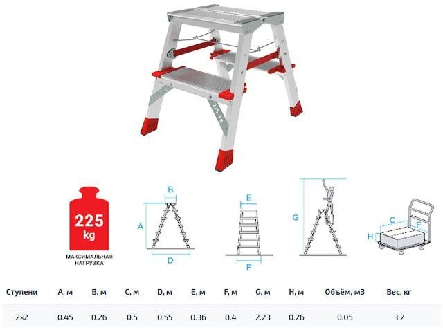 2 ступени 0,49х0,4х0,26 Ориентация ступеней на обе стороны позволяет работать, не переставляя стремянку и тем самым экономя время Максимальная прочность и надёжность при небольшом весе изделия Легко устанавливается и обеспечивает высокий уровень комфорта Стойки и ступени из экструдированных алюминиевых профилей увеличенного сечения Ступени глубиной 130 мм увеличенной толщины Рифлёная поверхность ступеней для безопасного подъёма и спуска Увеличенная площадка 260х350 мм Прочное крепление ступеней к боковинам заклёпками для более высокой устойчивости конструкции Прочные страховочные ремни Опорные наконечники из прочного пластика для устойчивого положения Компактность при хранении и транспортировке Практичность и внимание к каждой детали гарантируют безопасность работы на любой высоте