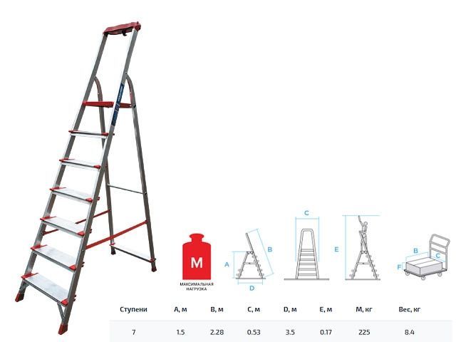 Вместительный лоток-органайзер для инструментов и материалов Максимальная прочность и надёжность при небольшом весе изделия Легко устанавливается и обеспечивает высокий уровень комфорта Стойки и ступени из экструдированных алюминиевых профилей увеличенного сечения Ступени глубиной 130 мм Рифлёная поверхность ступеней для безопасного подъёма и спуска Прочное крепление ступеней к боковинам заклёпками для более высокой устойчивости конструкции Рифлёная безопасная площадка из оцинкованной стали с порошковой покраской Дуга безопасности 600 мм Прочные страховочные ремни Опорные наконечники из прочного пластика для устойчивого положения Компактность при хранении и транспортировке Практичность и внимание к каждой детали гарантируют безопасность работы на любой высоте