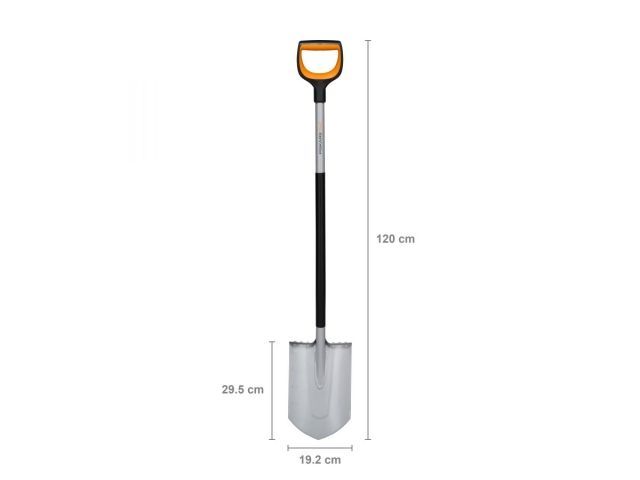 Садовая лопата. Материал лопаты - закаленная сталь с антикоррозийным покрытием. Материал черенка - полиамид, укрепленный стекловолокном. Рукоятка окрашена в стильный и яркий оранжевый цвет, чтобы избежать потери инвентаря. Фрикционная поверхность рукоятки позволяет выполнять любые виды садовых работ и удобно держать ее в руках. Для надежной фиксации черенка и лопаты специалисты компании Fiskars применяют новаторский тип сварки. Длина инструмента составляет 1,2 м. Размеры лопаты: 19,229,5 см. Вес инстумента - 2 кг.