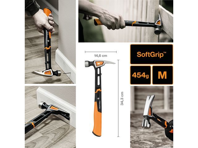 Молоток столярный подходит для забивания маленьких гвоздей Уникальная система поглощения вибрации до 70% Боек оснащен гвоздодером Вес бойка 16oz - 455 гр Длина рукоятки 13.5 - 340 мм