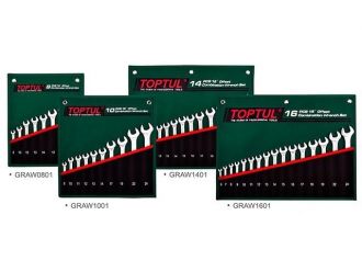 Набор ключей комбинированных в сумке Pro-Line TOPTUL состоит из 14 предметов размером 8, 9, 10, 11, 12, 13, 14, 15, 16, 17, 19, 21, 22 и 24 мм серии AABW0808-2224, имеющих окончание в виде рожкового ключа с одной стороны и окончание в виде накидного ключа с другой стороны.