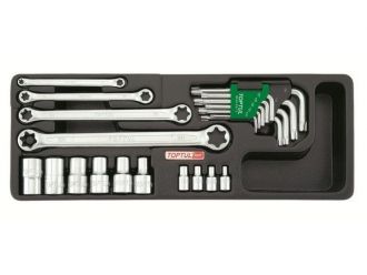 В состав набора входят: -ГоловкиTorx (звезда) 14: E4, E5, E6, E8 (серия BAED0804-0808) -Головки Torx (звезда) 12: E10, E12, E14, E16, E18, E20 (серия BAED1610-1620) -Ключи накидные Star (звезда): E6xE8, E10xE12, E14xE18, E20xE24 (серия AAEE0608-2024) -Ключи Г-образные TORX T10, T15, T20, T25, T27, T30, T40, T45, T50 (серия GAAL0913)