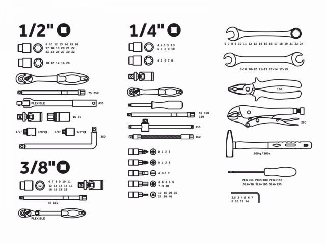 + Ключ комбинированный: 6, 7, 8, 9, 10, 11, 12, 13, 14, 15, 16, 17, 18, 19, 21, 22, 24 мм;