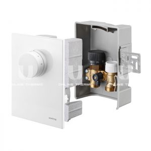 Терморегулятор «Unibox T-RTL» применяется для регулирования панельного отопления по температуре помещения с помощью термостатического вентиля и ограничения температуры обратного потока вентилем RTLH. Устанавливается в комбинации с радиаторным отоплением, максимальная температура подачи 70°С. «Unibox T-RTL» необходимо устанавливать таким образом, чтобы теплоноситель проходил сначала через отопительный контур, а затем через вентиль. Монтажный набор состоит из: преднастраиваемого термостатического вентиля, встроенного ограничителя обратного потока, воздухоотводчика с возможностью промывки, термостата с нулевой отметкой и монтажной коробки с крышкой. Максимальное рабочее давление: 10 бар; Максимальная рабочая температура: 100°С; Монтажная глубина: 57 мм; Диапазон настройки термостата: 7 -28°С; Kvs: 0.81; Диапазон настройки обратного потока: 20 - 40°С; Максимальная температура подающей линии: 70°С.