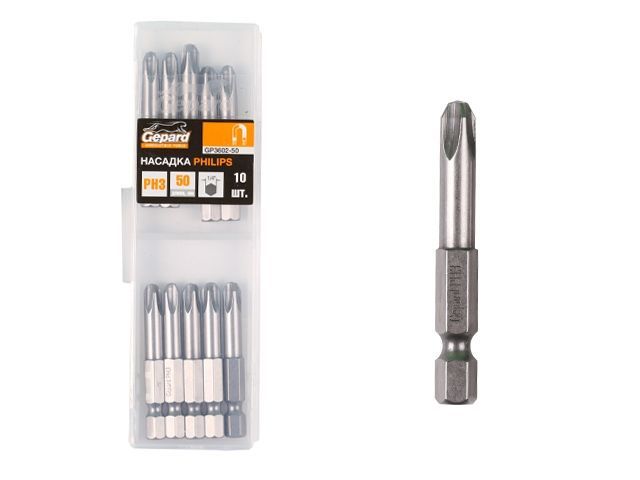 Насадка крестообразная PH2 50мм 10шт GEPARD (GP3601-50)(бита Phillips сталь S2 магнитная)