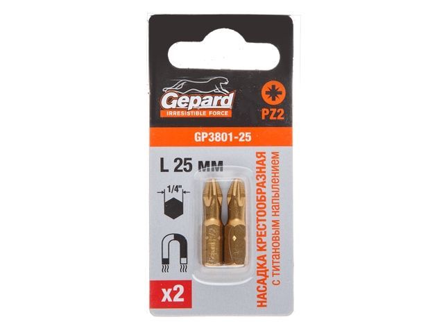 Насадка крестообразная PZ2 25мм 2шт с титановым напылением GEPARD (GP3801-25)(бита Pozidrive позидрив сталь S2 магнитная TIN покрытие)