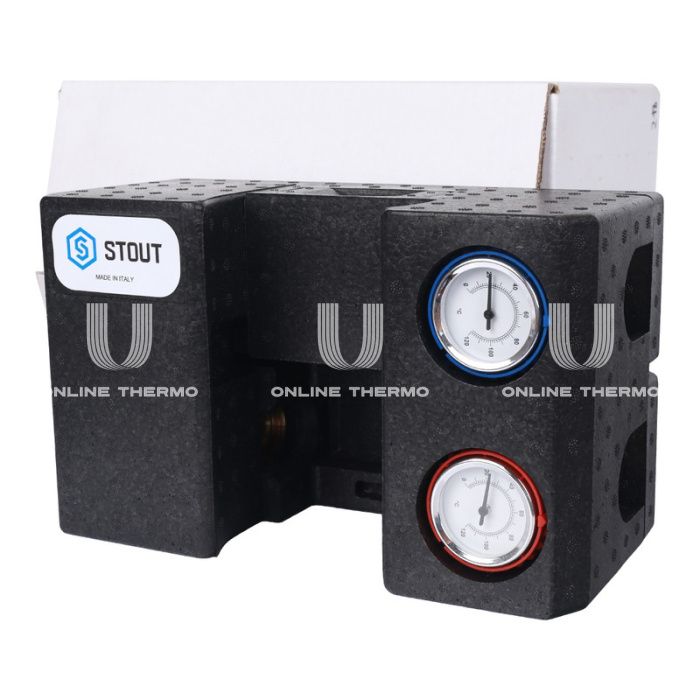 Насосные группы Stout являются элементами гидромодуля быстрого монтажа полной заводской готовности. Предназначены для обеспечения требуемого температурного и гидравлического режимов в системах теплопотребления здания. Насосная группа быстрого монтажа с четырёхходовым термостатическим клапаном предназначена для обеспечения принудительной циркуляции и поддержания постоянной температуры теплоносителя в системе отопления, например, в системе типа «теплый пол». Поддержание фиксированной точки температуры достигается при помощи термостатического элемента, который встроен внутрь клапана и перемещается благодаря расширению рабочего тела внутри него. Насосная группа может поставляться как в комплекте с насосом Grundfos, так и без него. Во втором случае возможно использование любого другого аналогичного насоса с соответствующей монтажной длиной и наружной резьбой под гайки для присоединения насоса к деталям группы. Со стороны системы теплопотребления все насосные группы снабжены запорными шаровыми кранами, совмещенными со стрелочными термометрами. На возвратной линии шаровой кран совмещен с обратным клапаном. Насосные группы DN25 (SDG-0002-002501,SDG-0002-002502, SDG-0002-002503)имеют штуцеры для установки байпасного перепускного клапана.