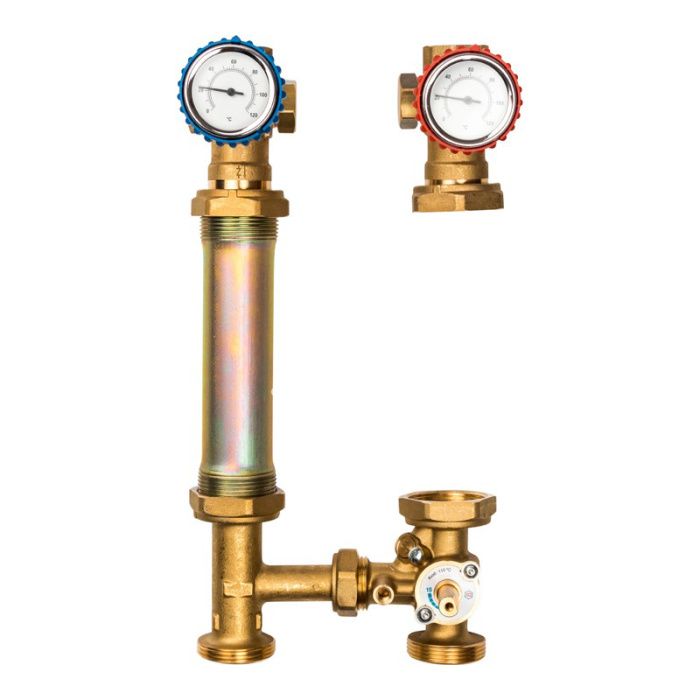 Насосные группы Stout являются элементами гидромодуля быстрого монтажа полной заводской готовности. Предназначены для обеспечения требуемого температурного и гидравлического режимов в системах теплопотребления здания. Насосная группа с трёхходовым приводным смесителем, предназначена для обеспечения гидравлического и температурного режимов в системе отопления с переменной температурой теплоносителя. Насосная группа с трёхходовым приводным смесителем позволяет производить циркуляцию и регулировку температуры теплоносителя, поступающего из первичного контура при помощи 3-х ходового смесительного клапана с управляющей рукояткой(без электропривода). При необходимости автоматического управления на клапан может быть установлен электропривод Stout. Насосная группа может поставляться как в комплекте с насосом Grundfos, так и без него. Во втором случае возможно использование любого другого аналогичного насоса с соответствующей монтажной длиной и наружной резьбой под гайки для присоединения насоса к деталям группы. Со стороны системы теплопотребления все насосные группы снабжены запорными шаровыми кранами, совмещенными со стрелочными термометрами. На возвратной линии шаровой кран совмещен с обратным клапаном. Насосные группы DN25 (SDG-0007-002501,SDG-0007-002502,SDG-0007-002503) имеют штуцеры для установки байпасного перепускного клапана.