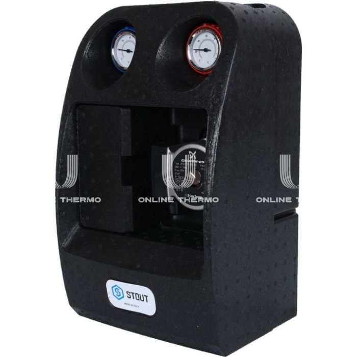 Насосные группы Stout являются элементами групп быстрого монтажа полной заводской готовности. Предназначены для обеспечения требуемого температурного и гидравлического режимов в системах теплопотребления здания. Насосная группа с теплообменником Stout используются для разделения первичного и вторичного контуров, заполненных различными теплоносителями. Насосная группа может поставляться как в комплекте с насосом Grundfos, так и без него. Во втором случае возможно использование любого другого аналогичного насоса с соответствующей монтажной длиной и наружной резьбой под гайки для присоединения насоса к деталям группы. Со стороны системы теплопотребления все насосные группы снабжены запорными шаровыми кранами, совмещенными со стрелочными термометрами. На возвратной линии шаровой кран совмещен с обратным клапаном.