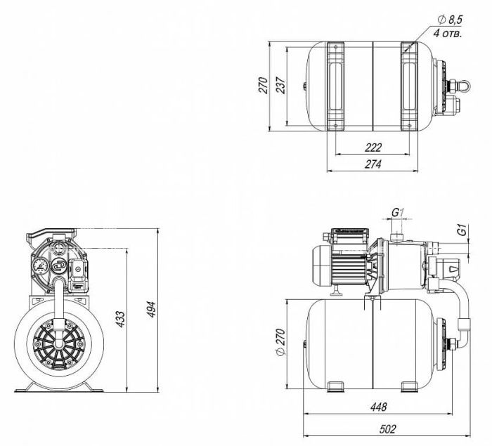 Поверхностные насосы-автоматы «Джамбо» с гидроаккумулятором предназначены для подачи воды из колодцев, скважин, открытых водоемов, а также для повышения давления в сетях центрального водоснабжения. Технические особенности: Благодаря реле давления, насос работает в автоматическом режиме. Гидроаккумулятор – смягчает гидроудар в момент пуска насоса и увеличивает ресурс насоса. Легкий первый запуск. Благодаря удобным заливным и сливным отверстиям насос легко ввести в эксплуатацию и подготовить к консервации. Комбинированный фланец. Глубина всасывания до 9 м обеспечивается встроенным эжектором. Непрерывная работа насоса обеспечивается принудительным охлаждением двигателя. Ограничения: Не допускается заужение всасывающей магистрали менее чем 25 мм (внутренний диаметр). Не допускайте работы насоса без воды или без расхода воды - «в тупик». Не допускается попадание воздуха во всасывающую магистраль. Необходимо устанавливать обратный клапан в самой нижней точке трубопровода при заборе воды из колодца или скважины. При подключении к «игольчатой» скважине или магистральному трубопроводу - перед входным штуцером насоса на всасывающей магистрали. В случае нестабильного напряжения в сети, необходимо устанавливать стабилизатор напряжения.