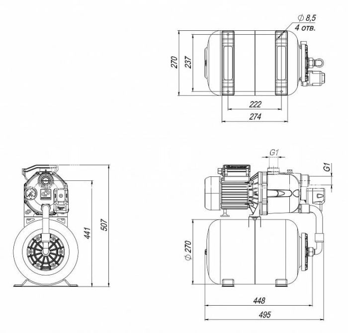 Поверхностные насосы-автоматы «Джамбо» с гидроаккумулятором предназначены для подачи воды из колодцев, скважин, открытых водоемов, а также для повышения давления в сетях центрального водоснабжения. Технические особенности: Благодаря реле давления, насос работает в автоматическом режиме. Гидроаккумулятор – смягчает гидроудар в момент пуска насоса и увеличивает ресурс насоса. Легкий первый запуск. Благодаря удобным заливным и сливным отверстиям насос легко ввести в эксплуатацию и подготовить к консервации. Комбинированный фланец. Глубина всасывания до 9 м обеспечивается встроенным эжектором. Непрерывная работа насоса обеспечивается принудительным охлаждением двигателя. Ограничения: Не допускается заужение всасывающей магистрали менее чем 25 мм (внутренний диаметр). Не допускайте работы насоса без воды или без расхода воды - «в тупик». Не допускается попадание воздуха во всасывающую магистраль. Необходимо устанавливать обратный клапан в самой нижней точке трубопровода при заборе воды из колодца или скважины. При подключении к «игольчатой» скважине или магистральному трубопроводу - перед входным штуцером насоса на всасывающей магистрали. В случае нестабильного напряжения в сети, необходимо устанавливать стабилизатор напряжения.