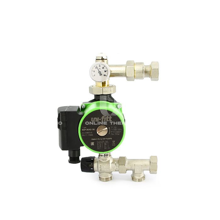 Насосно-смесительная группа SOLOMIX Х Uni-Fitt предназначена для создания низкотемпературных систем отопления (типа «тёплый пол»). Монтируется на коллекторной группе низкотемпературного контура, подключается к высокотемпературному контуру системы отопления. Насосно-смесительная группа SOLOMIX Х Uni-Fitt поставляется в 10 вариантах: С наружной резьбой без насоса (для монтажа требуется установка насоса), артикул 473M0000; с насосом Uni-Fitt SCP 25/60 130, артикул 473S0800; с насосом Wilo RS 25/6-130, артикул 473W0800; с насосом Grundfos UPSO 25-65 130, артикул 473G0800; с энергоэффективным насосом Uni-Fitt ECP 25/60 130, артикул 473E0800; с энергоэффективным насосом Wilo Para 25/6-130, артикул 473P0800; с энергоэффективным насосом Grundfos UPM3 AUTO 25-70 130, артикул 473U0800. С накидной гайкой без насоса (для монтажа требуется установка насоса), артикул 473F0000; с насосом Uni-Fitt SCP 25/60 130, артикул 473S0802; с насосом Wilo RS 25/6-130, артикул 473W0802; с насосом Grundfos UPSO 25-65 130, артикул 473G0802; с энергоэффективным насосом Uni-Fitt ECP 25/60 130, артикул 473E0802; с энергоэффективным насосом Wilo Para 25/6-130, артикул 473P0802; с энергоэффективным насосом Grundfos UPM3 AUTO 25-70 130, артикул 473U0802. Комплектация: верхний гидравлический блок (подача в низкотемпературный контур отопления), включающий автоматический клапан для удаления воздуха 1/2", контрольный термометр и эксцентрик с наружной резьбой или накидной гайкой со стороны подключения коллектора; нижний гидравлический блок (возврат из низкотемпературного контура отопления) состоит из 3-ходового термостатического смесительного клапана и тройника с наружной резьбой или накидной гайкой со стороны подключения коллектора; циркуляционный насос (в зависимости от комплектации); паспорт.