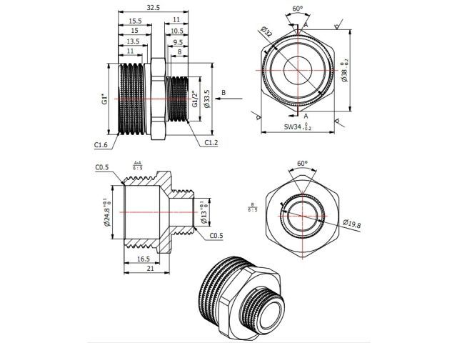 Ниппель ред. 1' нар. х 1/2' нар., AV Engineering (инд. упак.)(Латунь, макс. 16 бар, макс. 100 °С)