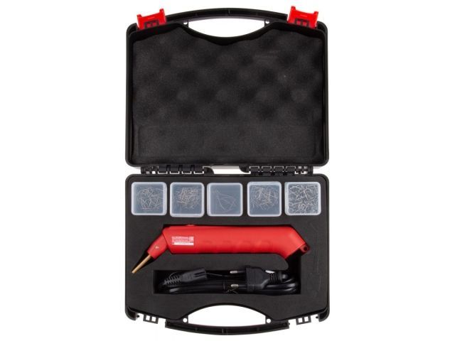 Инструмент предназначен для ремонта всех видов пластика, а именно: бамперов автомобилей, крыльев, контейнеров, пластиковой мебели и многого другого. Кроме того, паяльник применятся для профилактического усиления пластика в местах возможного излома. Инструмент обладает эргономичной формой и имеет противоударный корпус. В комплект поставки входит 4 вида скоб по 50 шт. и 1 вид скоб 5 шт. В 2 сопла, которые выходят из корпуса, вставляется металлическая скоба, под воздействием температуры она нагревается и помещается в трещину, образовавшуюся в пластике, с целью её устранения. Напряжение сети, В: 230; Частота сети, Гц: 50; Максимальная мощность, Вт: 70; Степень защиты: IP20; Макс. температура жала, С: 402; Время нагрева, с: 3; Вес, г: 260; Комплект поставки: Импульсный паяльник для пластика - 1 шт.; Скоба плоская 0,8 мм - 50 шт.; Скоба плоская 0,6 мм - 50 шт.; Скоба волнообразная - 50 шт.; Скоба угловая - 50 шт.; Скоба угловая 0,1 мм - 5 шт.; Инструкция по эксплуатации - 1 шт.; Кейс - 1 шт.;