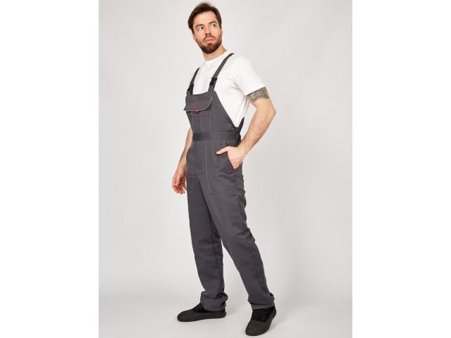Полукомбинезон прямого силуэта с застёжкой в левом боковом шве на три петли и пуговицу, гульфик на молнии. Бретели на резинках регулируются фастексами. На нагруднике расположен двойной накладной карман с клапаном на контактной ленте, малый накладной карман разделён на три части. Боковые накладные карманы имеют наклонную линию входа. На задней половине расположен фигурный накладной карман. Есть двойной карман для инструментов.