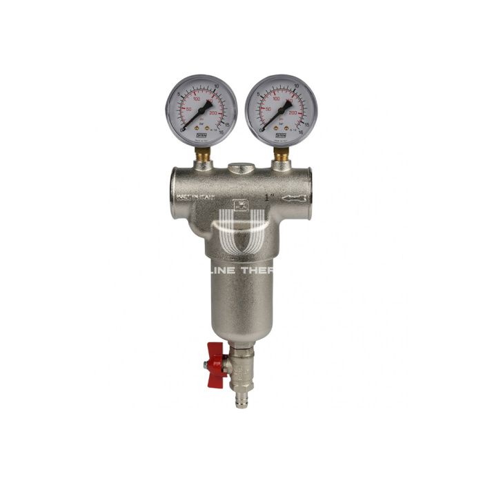 Промывной фильтр механической очистки Itap с двумя манометрами используется для очистки потока воды от механических примесей в системах трубопроводов горячей и холодной воды. Фильтр комплектуется извлекаемым картриджем, двумя манометрами и краном со штуцером для слива загрязнений. Корпус промывного фильтра изготавливается из латуни с никелированным покрытием, а фильтрующий элемент – из нержавеющей стали. Фильтрующая способность составляет 300 мкм. Фильтр должен устанавливаться корпусом вниз, направление стрелки на оголовке должно совпадать с направлением движения воды. Фильтр не должен испытывать нагрузок от трубопровода (изгиб, сжатие, растяжение, кручение, перекосы, вибрация, несоосность патрубков, неравномерность затяжки крепежа). Основной особенностью данного фильтра является наличие двух манометров, на входе в фильтр и на выходе. Совпадение значений означает, что фильтр чист, а разница в показаниях означает загрязнение фильтра и необходимость его промывки путем открытия сливного крана. При промывке следует предусмотреть отвод воды от сливного крана, выходящей под давлением.