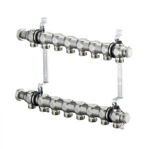 Multidis SH - гребенка из нержавеющей стали для подключения отопительных приборов, в смонтированном виде. Подающий и обратный коллектор из нержавеющей стали с отводами G 3 ⁄ 4 НР (евроконус) для присоединительных наборов Oventrop со стяжным кольцом. На входе и выходе накидные гайки G 1 ВР для непосредственного подключения шаровых кранов с плоским уплотнением. С воздухоспускными пробками G 1 ⁄ 2 , заглушками G 1 ⁄ 2 и торцевыми заглушками G 3 ⁄ 4 . Все латунные части никелированные. Макс. рабоч. температура t: +100°C; Мин. рабоч. температура t: –10°C; Макс. рабоч. давление p: 1000 кПа (10 бар); Значение kvs: 1,5 м³/ч. Гребенки Oventrop устанавливаются в системах отопления с принудительной циркуляцией.Они применяются как для однотрубных, так и двухтрубных систем. В двухтрубных системах отопления каждый вход и выход отопительного прибора с помощью трубопровода подключается к гребенке. Для подключения к одному контуру нескольких отопительных приборов в программе Oventrop имеются присоединительные h-элементы. В однотрубных системах отопления может потребоваться гидравлическая увязка отдельных контуров гребенки. В этом случае на отводах гребенки необходимо дополнительно установить „Combi 2“.