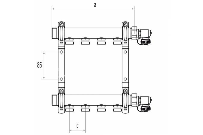 Распределительные коллекторы Rehau HLV из нержавеющей стали предназначены для разводки контуров систем радиаторного отопления. Нерегулируемая коллекторная группа представляет из себя подающий и обратный коллекторы G1" с наружной резьбой, которые зафиксированы между собой при помощи звукоизолированных оцинкованных кронштейнов, на каждой из распределительных труб находятся ниппельные отводы под соединение Евроконус G3/4". В комплект уже входят две никелированные заглушки G1" со встроенными воздушными клапанами и уплотнением. С распределительными коллекторами HLV можно использовать комплект двух прямых никелированных шаровых кранов 1" (арт. 12081221001) или комплект двух угловых никелированных шаровых кранов 1" (арт. 13152241001). a=208 мм – для коллектора на два выхода, каждый дополнительный выход +50 мм b=210 мм c=50 мм