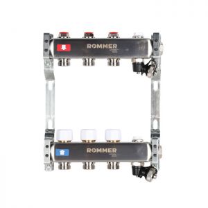 Коллекторные распределительные блоки Rommer предназначены для улучшения производительности систем отопления зданий, за счет равномерного распределения теплоносителя по контурам. Коллекторы могут использоваться как в домах индивидуальной застройки, так и в системах отопления многоквартирных жилых зданий, где требуется распределение потока теплоносителя между помещениями на этаже многоквартирного многоэтажного жилого или административного здания. Коллекторные блоки выполняют следующие функции: независимое друг от друга присоединение контуров системы отопления и распределение по ним теплоносителя; гидравлическая балансировка системы в пределах квартиры, обслуживаемой одним коллекторным блоком; регулирование температуры воздуха в отапливаемых помещениях; удаление воздуха из системы отопления и ее дренаж; отключение отдельных контуров и системы отопления в целом. Распределительный коллекторный блок Rommer состоит из подающей и обратной гребенок, каждая из которых имеет от 2 до 12 выходов. Подающая гребенка имеет возможность отключения (перекрытия) каждого отдельного контура системы отопления или теплого пола, для чего оснащается расходомерами, либо запорно-регулирующими клапанами. Обратная гребенка оборудуется терморегулирующими клапанами с предварительной настройкой пропускной способности. Терморегулирующие клапаны могут быть автоматизированы с помощью термоэлектрических сервоприводов. Для ограничения расхода теплоносителя на каждый отвод выполняется предварительная настройка пропускной способности. Коллектор с запорными клапанами укомплектован: 1 обратный коллектор с отсечными клапанами под электротермоприводы; 1 подающий коллектор с запорными вентилями; 2 цельнометаллических кронштейна; 2 клапана выпуска воздуха и 2 сливных крана.