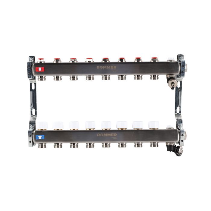 Распределительный коллектор (группа) для отопления Rommer RMS-3201-000008 ВР 1", на 8 контуров 3/4" EK, нержавеющая сталь