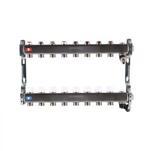 Коллекторные распределительные блоки Rommer предназначены для улучшения производительности систем отопления зданий, за счет равномерного распределения теплоносителя по контурам. Коллекторы могут использоваться как в домах индивидуальной застройки, так и в системах отопления многоквартирных жилых зданий, где требуется распределение потока теплоносителя между помещениями на этаже многоквартирного многоэтажного жилого или административного здания. Коллекторные блоки выполняют следующие функции: независимое друг от друга присоединение контуров системы отопления и распределение по ним теплоносителя; гидравлическая балансировка системы в пределах квартиры, обслуживаемой одним коллекторным блоком; регулирование температуры воздуха в отапливаемых помещениях; удаление воздуха из системы отопления и ее дренаж; отключение отдельных контуров и системы отопления в целом. Распределительный коллекторный блок Rommer состоит из подающей и обратной гребенок, каждая из которых имеет от 2 до 12 выходов. Подающая гребенка имеет возможность отключения (перекрытия) каждого отдельного контура системы отопления или теплого пола, для чего оснащается расходомерами, либо запорно-регулирующими клапанами. Обратная гребенка оборудуется терморегулирующими клапанами с предварительной настройкой пропускной способности. Терморегулирующие клапаны могут быть автоматизированы с помощью термоэлектрических сервоприводов. Для ограничения расхода теплоносителя на каждый отвод выполняется предварительная настройка пропускной способности. Коллектор с запорными клапанами укомплектован: 1 обратный коллектор с отсечными клапанами под электротермоприводы; 1 подающий коллектор с запорными вентилями; 2 цельнометаллических кронштейна; 2 клапана выпуска воздуха и 2 сливных крана.