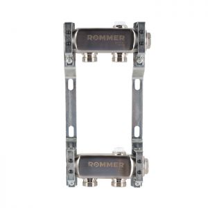 Коллекторные распределительные блоки Rommer предназначены для улучшения производительности систем отопления зданий, за счет равномерного распределения теплоносителя по контурам. Коллекторы могут использоваться как в домах индивидуальной застройки, так и в системах отопления многоквартирных жилых зданий, где требуется распределение потока теплоносителя между помещениями на этаже многоквартирного многоэтажного жилого или административного здания. Коллекторные блоки выполняют следующие функции: независимое друг от друга присоединение контуров системы отопления и распределение по ним теплоносителя; гидравлическая балансировка системы в пределах квартиры, обслуживаемой одним коллекторным блоком; регулирование температуры воздуха в отапливаемых помещениях; удаление воздуха из системы отопления и ее дренаж; отключение отдельных контуров и системы отопления в целом. Распределительный коллекторный блок Rommer состоит из подающей и обратной гребенок, каждая из которых имеет от 2 до 12 выходов. Подающая гребенка имеет возможность отключения (перекрытия) каждого отдельного контура системы отопления или теплого пола, для чего оснащается расходомерами, либо запорно-регулирующими клапанами. Обратная гребенка оборудуется терморегулирующими клапанами с предварительной настройкой пропускной способности. Терморегулирующие клапаны могут быть автоматизированы с помощью термоэлектрических сервоприводов. Для ограничения расхода теплоносителя на каждый отвод выполняется предварительная настройка пропускной способности. Коллектор для радиаторной разводки укомплектован: 1 обратный коллектор с воздухоотводчиком; 1 напорный коллектор с воздухоотводчиком; 2 цельнометаллических кронштейна.