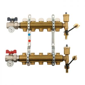 Распределительный коллектор (группа) для отопления Tiemme 3870006 ВР-НР 1", на 5 контуров НР 3/4" ЕК, латунь, с концевыми группами, с шаровыми кранами