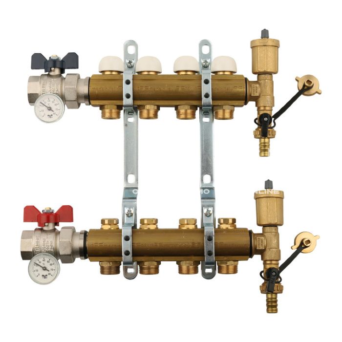 Распределительный коллектор (группа) для отопления Tiemme 3870012 ВР-НР 1", на 4 контура НР 3/4" ЕК, латунь, с концевыми группами, с шаровыми кранами