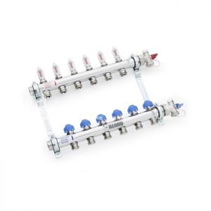 Распределительные коллекторы Rehau HKV-D из нержавеющей стали предназначены для систем обогрева поверхностей, в первую очередь для систем напольного водяного отопления. Регулируемая коллекторная группа представляет из себя подающий и обратный коллекторы G1" с наружной резьбой с расходомерами на подающей трубе и с запорными вентилями на обратной трубе. Коллекторы зафиксированы между собой при помощи звукоизолированных оцинкованных кронштейнов, на каждой из распределительных труб находятся ниппельные отводы под соединение евроконус G3/4". Обратная линия может быть укомплектована сервоприводами (сервомоторами) для автоматического регулирования, резьба подключения сервопривода - М30х1.5. В комплект уже входят две никелированные заглушки G1" со встроенными воздушными клапанами и уплотнением. С распределительными коллекторами HKV-D можно использовать комплект двух прямых никелированных шаровых кранов 1" (арт. 12081221001) или комплект двух угловых никелированных шаровых кранов 1" (арт. 13152241001) . Коллекторные группы для водяного теплого пола с расходомерами используются для точной балансировки расхода теплоносителя в контурах напольного отопления. При необходимости управление контурами можно максимально автоматизировать путем регулирования через комнатные термостаты. Для этого потребуется укомплектовать коллекторные группы сервоприводами и модулями управления, которые связываются напрямую с термостатами.