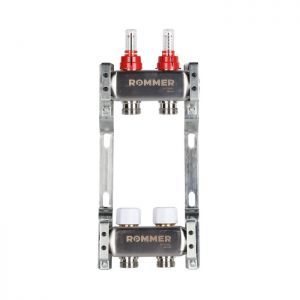Коллекторные распределительные блоки Rommer предназначены для улучшения производительности систем отопления зданий, за счет равномерного распределения теплоносителя по контурам. Коллекторы могут использоваться как в домах индивидуальной застройки, так и в системах отопления многоквартирных жилых зданий, где требуется распределение потока теплоносителя между помещениями на этаже многоквартирного многоэтажного жилого или административного здания. Коллекторные блоки выполняют следующие функции: независимое друг от друга присоединение контуров системы отопления и распределение по ним теплоносителя; гидравлическая балансировка системы в пределах квартиры, обслуживаемой одним коллекторным блоком; регулирование температуры воздуха в отапливаемых помещениях; удаление воздуха из системы отопления и ее дренаж; отключение отдельных контуров и системы отопления в целом. Распределительный коллекторный блок Rommer состоит из подающей и обратной гребенок, каждая из которых имеет от 2 до 12 выходов. Подающая гребенка имеет возможность отключения (перекрытия) каждого отдельного контура системы отопления или теплого пола, для чего оснащается расходомерами, либо запорно-регулирующими клапанами. Обратная гребенка оборудуется терморегулирующими клапанами с предварительной настройкой пропускной способности. Терморегулирующие клапаны могут быть автоматизированы с помощью термоэлектрических сервоприводов. Для ограничения расхода теплоносителя на каждый отвод выполняется предварительная настройка пропускной способности. Коллектор с расходомерами укомплектован: 1 обратный коллектор с отсечными клапанами под электротермоприводы; 1 подающий коллектор с расходомерами; 2 цельнометаллических кронштейна.