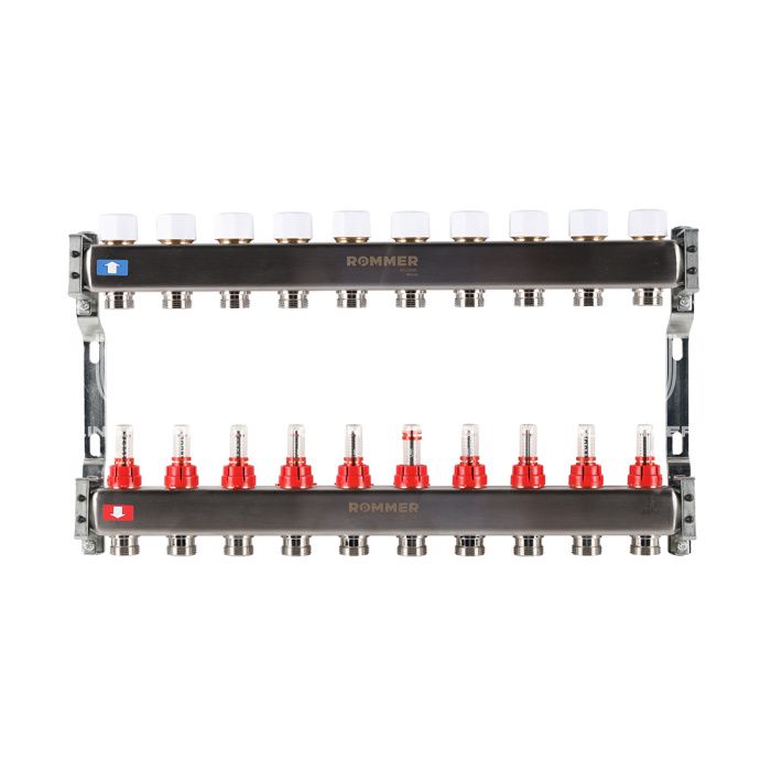 Распределительный коллектор (группа) с расходомерами Rommer RMS-1200-000010 ВР 1", на 10 контуров 3/4" EK, нержавеющая сталь