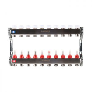 Коллекторные распределительные блоки Rommer предназначены для улучшения производительности систем отопления зданий, за счет равномерного распределения теплоносителя по контурам. Коллекторы могут использоваться как в домах индивидуальной застройки, так и в системах отопления многоквартирных жилых зданий, где требуется распределение потока теплоносителя между помещениями на этаже многоквартирного многоэтажного жилого или административного здания. Коллекторные блоки выполняют следующие функции: независимое друг от друга присоединение контуров системы отопления и распределение по ним теплоносителя; гидравлическая балансировка системы в пределах квартиры, обслуживаемой одним коллекторным блоком; регулирование температуры воздуха в отапливаемых помещениях; удаление воздуха из системы отопления и ее дренаж; отключение отдельных контуров и системы отопления в целом. Распределительный коллекторный блок Rommer состоит из подающей и обратной гребенок, каждая из которых имеет от 2 до 12 выходов. Подающая гребенка имеет возможность отключения (перекрытия) каждого отдельного контура системы отопления или теплого пола, для чего оснащается расходомерами, либо запорно-регулирующими клапанами. Обратная гребенка оборудуется терморегулирующими клапанами с предварительной настройкой пропускной способности. Терморегулирующие клапаны могут быть автоматизированы с помощью термоэлектрических сервоприводов. Для ограничения расхода теплоносителя на каждый отвод выполняется предварительная настройка пропускной способности. Коллектор с расходомерами укомплектован: 1 обратный коллектор с отсечными клапанами под электротермоприводы; 1 подающий коллектор с расходомерами; 2 цельнометаллических кронштейна.