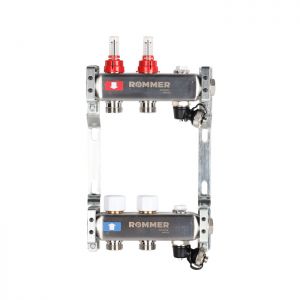 Коллекторные распределительные блоки Rommer предназначены для улучшения производительности систем отопления зданий, за счет равномерного распределения теплоносителя по контурам. Коллекторы могут использоваться как в домах индивидуальной застройки, так и в системах отопления многоквартирных жилых зданий, где требуется распределение потока теплоносителя между помещениями на этаже многоквартирного многоэтажного жилого или административного здания. Коллекторные блоки выполняют следующие функции: независимое друг от друга присоединение контуров системы отопления и распределение по ним теплоносителя; гидравлическая балансировка системы в пределах квартиры, обслуживаемой одним коллекторным блоком; регулирование температуры воздуха в отапливаемых помещениях; удаление воздуха из системы отопления и ее дренаж; отключение отдельных контуров и системы отопления в целом. Распределительный коллекторный блок Rommer состоит из подающей и обратной гребенок, каждая из которых имеет от 2 до 12 выходов. Подающая гребенка имеет возможность отключения (перекрытия) каждого отдельного контура системы отопления или теплого пола, для чего оснащается расходомерами, либо запорно-регулирующими клапанами. Обратная гребенка оборудуется терморегулирующими клапанами с предварительной настройкой пропускной способности. Терморегулирующие клапаны могут быть автоматизированы с помощью термоэлектрических сервоприводов. Для ограничения расхода теплоносителя на каждый отвод выполняется предварительная настройка пропускной способности. Коллектор с расходомерами укомплектован: 1 обратный коллектор с отсечными клапанами под электротермоприводы; 1 подающий коллектор с расходомерами; 2 цельнометаллических кронштейна; 2 клапана выпуска воздуха и 2 сливных крана.