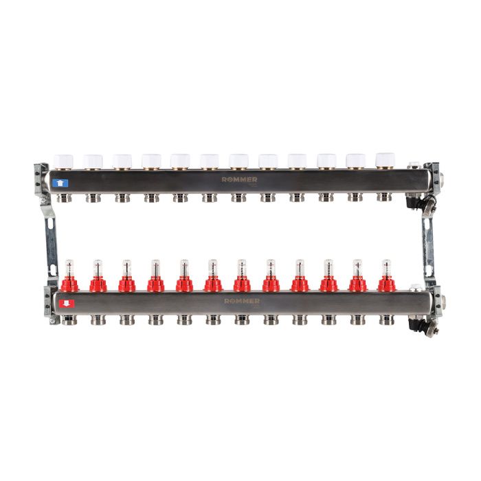 Распределительный коллектор (группа) с расходомерами Rommer RMS-1201-000012 ВР 1", на 12 контуров 3/4" EK, нержавеющая сталь