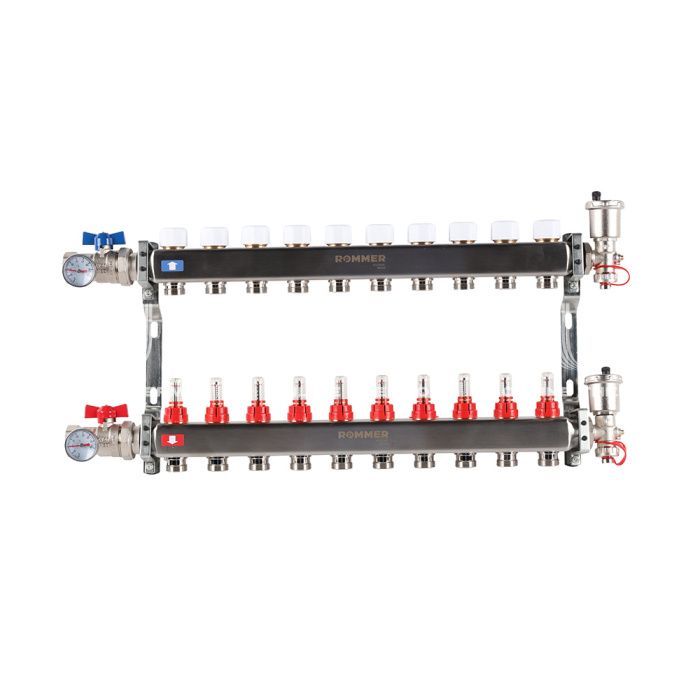 Распределительный коллектор (группа) с расходомерами Rommer RMS-1210-000010 ВР 1", на 10 контуров 3/4" EK, нержавеющая сталь