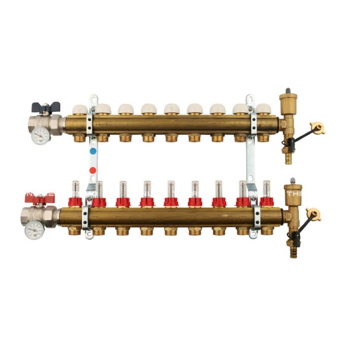 Распределительный коллектор (группа) с расходомерами Tiemme 3870009 ВР-НР 1", на 9 контуров НР 3/4" ЕК, латунь, с концевыми группами, с шаровыми кранами