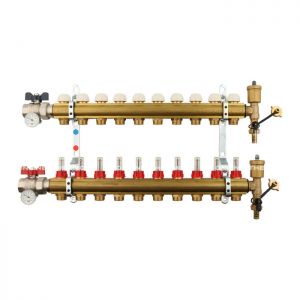 Распределительный коллектор (группа) с расходомерами Tiemme 3870011 ВР-НР 1", на 10 контуров НР 3/4" ЕК, латунь, с концевыми группами, с шаровыми кранами