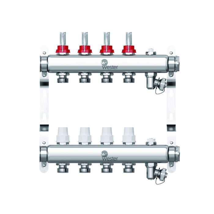 Распределительный коллектор (группа) с расходомерами Wester W902.4, 0-32-1820, 1", на 4 контура 3/4" EK, нержавеющая сталь